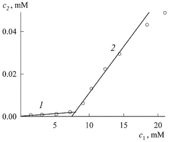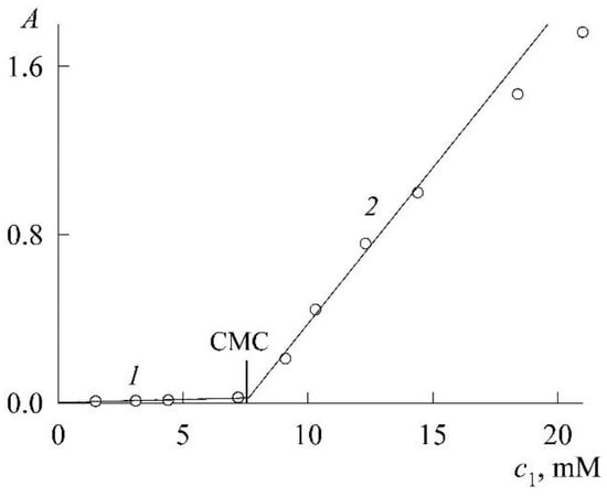 Like the dependence the solubilization curve consists of two sections (1 and 2, it can be said that the first corresponds to protomicelles, and the second to micelles) separated by the CMC. If the sections are approximated by straight lines, then the CMC can be found by their intersection. If the entire solubilization curve is constructed as a continuous line (it is visible in Figure 8 that the fourth point of Section 1 already lies above the straight line), then the CMC is defined as the point of maximum curvature of the line [1]. Recall that in classical colloid science, Section 1 is generally ignored, and Section 2 is called the solubilization curve, while the CMC is determined at the intersection of straight line 2 with the abscissa axis. Our method with two straight lines is more accurate and, as can be seen from Figure 8 gives the CMC value always slightly higher than the classical method.