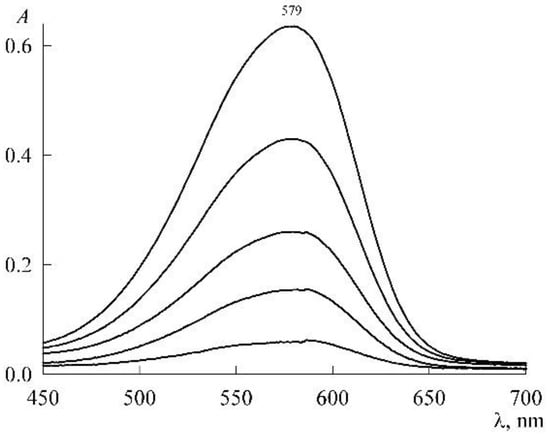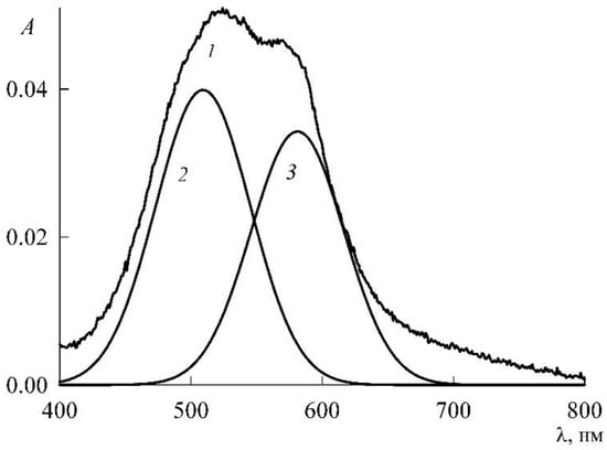The maxima of monomers and dimers in the spectra of Figure 11 are quite close and may partially overlap each other. In such cases, to clarify the picture, a special operation of spectrum decomposition is usually used, for which special programs have been created. We had the PeakFit mathematical package (Version 4 for Win 32, AISN Software Inc., Mapleton, OR, USA) at our disposal, and we applied it to the spectra of Figure 11. Figure 12 illustrates how this is done using the example of the decomposition of curve 1 in Figure 11. This refines the height and location of the peaks in the spectrum. The results obtained are summarized in Table 1 and shown in Figure 13.