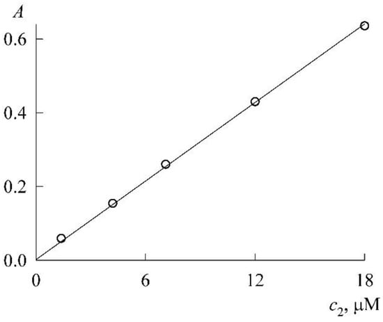 The experiment was organized as follows. In a micellar solution of SDS at a concentration of mM, solid NR was dissolved to a concentration of 46 μM. From it (by dilution with the same SDS stock solution at a concentration of 30 mM), NR solutions were prepared in the concentration range 1–18 μM, each with the SDS concentration still 30 mM (the change in the volume of the solution during the dissolution of solid NR was neglected). The absorption spectra of these solutions (Figure 5) are unchanged in both shape and position of the maximum (λmax = 579 nm), which is characteristic of the NR monomeric state. The experimental values of the optical density (A) at the maxima form the calibration curve (Figure 6), which is easily approximated by a linear dependence A(c2) with a slope angle of 3.4 × 104 M–1. If we take into account that the experiments were carried out in cuvettes with an optical path length of 1 cm, then for the monomer extinction coefficient NR in the SDS micellar medium, we obtain the value