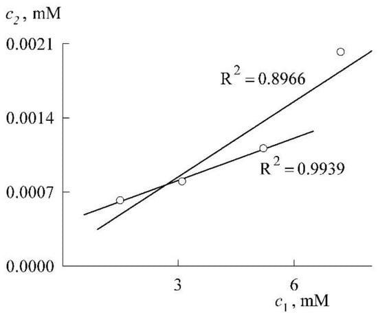In connection with the construction of the solubilization curve in the premicellar region, it is appropriate to make the following remark. Of the above four values of the points of this curve, the first three lie almost perfectly on the same straight line, and the addition of the fourth point significantly worsens the R2 indicator (the linear correlation coefficient, see Figure 9). This is in full agreement with Equation (4), which predicts a linear dependence in the limit of low concentrations. Obviously, the fourth point already requires taking into account the subsequent terms of the expansion of the exponent in Equation (4). It can be said, therefore, that the experiment confirms Equation (4).