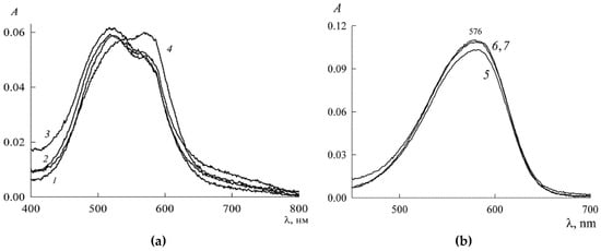 The resulting spectral data are shown in Figure 11. As follows from Figure 11a, at SDS concentrations in the range 5.5 > > 2.2 mM (curves 1–3), the optical density increases, which indicates the reverse process of the formation of NR monomers and dimers (λmax = 572 nm and λmax = 520 nm, respectively) due to the decomposition of higher-order aggregates with a predominance of dimers. At 7.5 mM (curve 4), the absorption band characteristic of NR dimers becomes less pronounced, and monomers come to the fore. At concentrations 9 mM, which exceeds the SDS CMC value, the absorption spectrum (curve 5) with a clearly defined maximum at 579 nm indicates the presence of mainly NR monomers. A further increase in the SDS concentration leads to a slight increase in the optical density (curves 6 and 7 in Figure 11b), the growth of which stops at 10 mM.