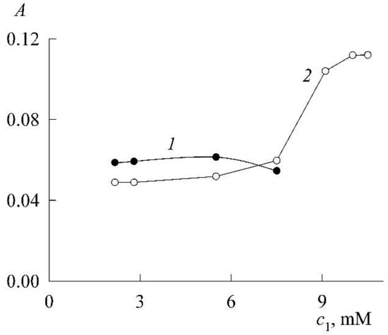 Figure 4 shows the experimental dependence A(c1) of the optical density on the SDS concentration, plotted from the values of A in the absorption maxima of NR monomers in their spectra (Figure 3). The initial section (curve 1 in Figure 4) of the dependence reflects the fact that SDS has a weak effect on the dissolution of NR in the concentration region where there are no micelles yet and only protomicelles are being formed. Gradual filling of the surface of NR molecules with SDS ions increases their solubility and leads to an increase in the concentration of NR monomers in solution, albeit slightly. In parallel, the optical density of the solution also increases. The break in the curve and the sharp increase in the increase in optical density (curve 2) are due to the appearance and increase in the number of SDS micelles capable of solubilizing NR. The break point corresponds to the CMC. The most accurate way to find it is as follows. Curve 1 and curve 2 (we take the first 4 points) are well approximated by straight lines (R2 is the coefficient of determination)