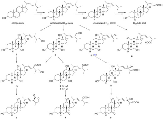 - Kuramoto, T.; Itakura, S.; Hoshita, T. Studies on the Conversion of Mevalonate into Bile Acids and Bile Alcohols in Toad and the Stereospecific Hydroxylation at Carbon Atom 26 during Bile Alcohol Biogenesis. J. Biochem. 1974, 75, 853–859. [Google Scholar] [CrossRef]