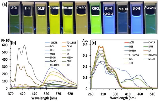 (a) Photographs (under 365 nm UV-illumination); (b) emission and (c) absorbance spectrum of HBT 2 (10 μM) recorded in various solvents of different polarity. Photographs were taken at concentration 10 μM of HBT 2.