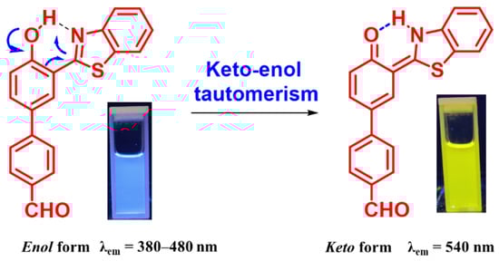 In the literature, the aggregation induced emission (AIE) process is normally associated with a restriction in intramolecular rotation (RIR) in a solid state or in an aggregated state [19]; however, many reports are available where the occurrence of an excited state intramolecular proton transfer (ESIPT) process in an aggregated state results in an enhancement in emission intensity commonly known as ESIPT coupled AIE [20]. In HBT 2, there is a possibility of ESIPT and AIE process. The ESIPT process was first validated by recording the absorbance and emission spectra of HBT 2 (10 µM) in solvents of different polarities (Figure 1). In non-polar solvents, HBT 2 showed absorption bands at 295, and 310 nm and the shoulder band at 340 nm, whereas in polar solvents the appearance of an additional band between 390 and 460 nm was also observed. This additional red-shifted band in polar solvents could be attributed to either a hydrogen bond cluster or due to the formation of an anion via deprotonation of the -OH group (Figure 1c). Similarly, the emission spectra of HBT 2 in non-polar solvents such as CHCl3, DCM and THF showed an emission band at 540 nm (λex = 360 nm), but in polar (protic) solvents a new band in the range of 380–480 nm was observed. This emission band at 380–480 nm could be attributed to the enol form while the bathochromically shifted emission band at 540 nm could be attributed to keto form arising due to the ESIPT process in HBT 2. The color of the HBT 2 solution in polar solvents is blue and in non-polar solvents, it is yellow, which is in good agreement with the assumption of the existence of enol-tautomer in polar solvents, and keto-tautomer in non-polar solvents (Figure 1a and Figure 2).