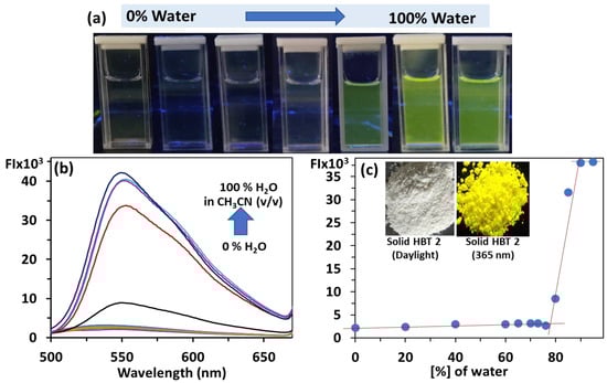 To validate the existence of AIE in HBT 2, we have recorded the optical spectra of HBT 2 in different binary aqueous mixtures where we have continuously varied the fraction of water (bad solvent) in CH3CN (good solvent) (Figure 3). In CH3CN, HBT 2 (0.5 μM) exhibits a very weak broad emission band between 500 and 600 nm. Upon incremental addition of the water fraction from 0–70%, no change in the emission spectrum was observed and the fluorescence remained low [φf = 0.022, measured against quinine sulfate (φf = 0.54) as standard solution in H2SO4]. When the fraction of water was further increased from >70–100% in CH3CN, a drastic boost in fluorescence intensity (~30 times) at 550 nm was observed (φf = 0.096) due to the formation of fluorescent nanoaggregates. The colorless solution of HBT 2 in ˂70% H2O–CH3CN mixture indicates the existence of HBT 2 in a non-aggregated state, whereas the observance of bright greenish-yellow-colored nanoaggregates in 70–99% water indicates the existence of HBT 2 in the aggregated state (Figure 3a,c).