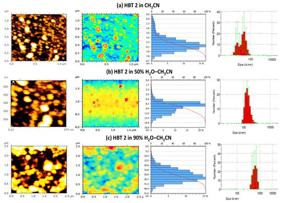 To shed more insight on the aggregation process and morphology of the aggregates of HBT 2 upon the addition of H2O to CH3CN, we have performed atomic force microscopic (AFM) imaging of HBT 2 in pure CH3CN, 50% HEPES buffer–CH3CN and 90% HEPES buffer–CH3CN solution. The AFM micrographs of HBT 2 (1 µM) in CH3CN showed spherical aggregates of the size of 0.9–7.8 nm uniformly distributed all over the surface. However, the size of the aggregates of HBT 2 increased to 1.7–14.9 nm in 50% H2O–CH3CN solution. On the other hand, in the 90% H2O–CH3CN solution, the size of the aggregates of HBT 2 increased to 10.3–47.4 nm. Interestingly, the morphology of the aggregates of HBT 2 in CH3CN, 50% HEPES buffer–CH3CN and 90% HEPES buffer–CH3CN remains spherical in nature and no change in morphology of these aggregates was observed as we move from CH3CN to 90% HEPES buffer–CH3CN solution (Figure 4a–c).
