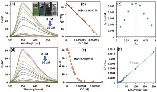 Upon addition of 0–20 equivalents of Cu2+ and Cu+ ions, the emission spectrum of HBT 2 showed a regular decrease in fluorescence at 520 nm with concomitant fluorescence color change from bright yellow to colorless (Figure 5a,d). On further addition of Cu2+ and Cu+ ions (˃20 equivalents), no change in the fluorescence spectrum was observed and the plateau was achieved. It may be noted that plateau was achieved at lower concentrations for Cu+ (six equivalents) ions compared to Cu2+ (10 equivalents) ions. This decrease in fluorescence could be attributed to the complexation of Cu+ or Cu2+ ions with oxygen and nitrogen atoms of HBT 2 which results in the inhibition of the ESIPT process and fluorescence quenching was observed. Alternatively, the binding of Cu2+ or Cu+ ions with HBT 2 may disturb the aggregation of HBT 2 and consequently, the inhibition of AIE could lead to quenching of the fluorescence. The lowest limit of detection was found to be 69 nM (R2 = 0.99) and 250 nM (R2 = 0.99) for Cu+ and Cu2+, respectively (Figure 5b,e). The Job’s plot between HBT 2 and Cu2+ ions showed 1:1 binding stoichiometry (Figure 5c). The Benesi–Hildebrand (B-H) plot was used to find the binding constant of complexation between HBT 2 and Cu2+ ions and it was found to be 7.14 × 104 M−1 (Figure 5f). The non-linear regression curve fitting analysis using SPECFIT programmer revealed 1:1 stoichiometry with a binding constant of log β = 5.829 (for Cu+) and log β = 5.454 (for Cu2+). The absorbance spectrum of HBT 2 did not show any variation upon the addition of Cu2+ ions in a 90% H2O–CH3CN mixture.
