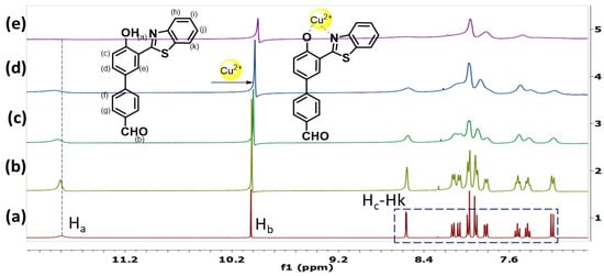 To obtain further insight into the mechanism of complexation between HBT 2 and Cu2+ ions, we have performed the NMR titration in the absence and presence of Cu2+ ions (Figure 6). Upon addition of 1, 3, 5 and 10 equivalents of Cu2+ ions in HBT 2, the -OH peak of HBT 2 at δ = 11.8 ppm broadened and then disappeared whereas the sharp doublet of Hc at δ = 8.565 ppm shifted up-field to δ = 8.547 and then broadened. Furthermore, the 1H NMR analysis showed an up-field shift of the aldehyde proton at δ = 10 ppm to 9.96 ppm whereas signals of the aromatic protons Hd–Hk become upfield shifted and merged with each other with concomitant broadening upon gradual addition of Cu2+ ions. These NMR changes could be due to the complexation of Cu2+ with -OH and -N of the HBT 2 which caused the deprotonation of -OH. The broadening of the signals may be due to the paramagnetic effect of the Cu2+ ions bound to HBT 2.