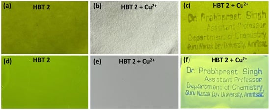Subsequently, we stamped several alphabets (using the stamp of the principal Investigator) on HBT 2 coated filter paper and TLC strips by using a stamp pad immersed in Cu2+ ions (1 mM) solution as a security ink. Under normal daylight, no alphabets were seen on these HBT 2 coated filter paper or TLC strips (Figure 8b,e). However, upon illumination of these HBT 2 coated filter paper and TLC strips with UV light of 365 nm, the dark coloured alphabets of the stamp can be clearly seen (Figure 8c,f). This could be ascribed to the quenching of the greenish-yellow fluorescence of the HBT 2 by Cu2+ ions. Moreover, by using a high concentration of Cu2+ ions (5 mM), it is possible to see the alphabets of stamps with the naked eye in daylight as green colour alphabets (Figure S11 from Supplementary Materials).