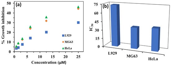 To check the cytotoxicity of HBT 2, we performed the MTT assay on different cell lines such as HeLa cells (cervical cancer cells), MG 63 cells (bone cancer cells) and L929 cells (normal fibroblast cells) to confirm the cellular death response. The cells were treated with various concentrations of HBT 2 (0.78, 1.56, 3.125, 6.25, 12.5 and 25 µM) for HeLa, MG 63 and L929 cells followed by incubation for 24 h. We observed that HBT 2 showed cytotoxicity (IC50 = 37.3 ± 1.12 μM) and selectivity index = 1.96 against the MG 63 cells and IC50 = 39.58 ± 1.25 µM and selectivity index = 1.85 against HeLa cells in comparison to normal L929 cells (IC50 = 73.46 ± 1.28 µM). It has also been found that the cell viability has been reduced on treatment with HBT 2 in a dose-dependent manner (Figure 10 and Figure S12 from Supplementary Materials).