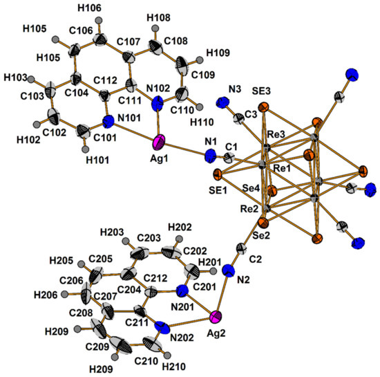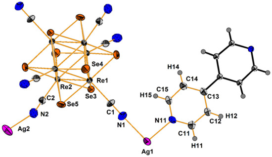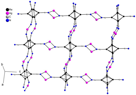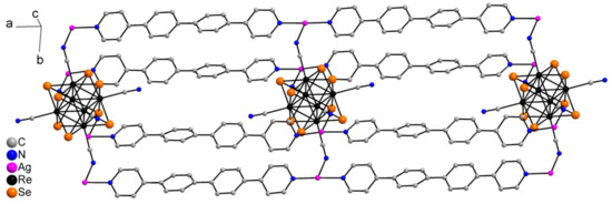 Compound 4 crystallizes in monoclinic crystal system, C2/m space group. The asymmetric unit is presented by two Re atoms, three Se atoms, two N and C atoms of cyanide groups, two Ag atom and one ring (five C, one N and four H atoms) of 4,4′-bypiridine (Figure 11). Besides, one solvate molecule of acetonitrile is presented. The coordination environment of Ag1 atom includes two N11 atoms of bipy and one N2 atom of cyanide group with bond length equal to 2.23 and 2.47 Å, respectively. Additionally, Ag1 forms a long bond with the N2 atom of the adjacent cluster complex with length equal to 2.68 Å. The coordination polyhedron is a distorted tetrahedron (Figure 12a). The coordination environment of Ag2 atom consists of two N atoms of cyanide groups (dAg–N = 2.14 Å) and one Se atom (dAg–Se = 2.78 Å). Moreover, the Ag2 atom forms a bond with the C atom of cyanide group of the neighbouring cluster complex with dAg–C = 2.50 Å. The coordination polyhedron is a distorted tetrahedron (Figure 12b). The cluster complex bonds six Ag atoms via cyanide groups. Two Ag1 atoms are apical, and four Ag2 atoms are bridging. Ag1 atoms are linked via bipy ligands. Thus, a polymeric ribbon (1D structure) is formed (Figure 13). Each cluster complex forms two Ag–Se bonds with two Ag atoms of the neighboring ribbons. Additionally, Ag1 and Ag2 atoms form bonds with N1 and C1 atoms of the neighboring ribbons forming a framework (Figure 14). It should be noted that there are no π–π interactions between aromatic rings of 4,4′-bipyridine molecules or argentophilic interactions in the structure 4.