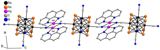 The asymmetric unit of compound 5 contains three Re atoms of the cluster core, three cyanide ligands, four μ3-Se ligands, two Ag+ cations and two dpbp ligands (Figure 15). The coordination environment of Ag1 includes two N atoms of two different dpbp ligands (N11 and N12), one N atom of a cyanide group (N1) and one Se atom. Ag1–N11, Ag–N12 and Ag1–N1 bond lengths are equal to 2.2, 2.21 and 2.50 Å, respectively. The Ag1–Se1 bond length is equal to 3.06 Å. Ag1 is tetra-coordinated with the geometry of coordination environment close to square planar (Figure 16a). The coordination environment of Ag2 atom includes two N atoms of two dpbp ligands and one N atom of a cyanide group. The Ag–N distances are equal to 2.177 and 2.164 Å in the case of dpbp ligands and 2.62 Å for CN group. Three coordinated Ag2 with Ndpbp–Ag–Ndpbp angles equal 176.6° and have a T-shaped environment (Figure 16b). The coordination environment of the cluster complex is presented by four Ag atoms (two Ag1 and two Ag2) bonded to cyanide groups. Silver atoms, in turn, are linked in chains by N atoms of dpbp ligand. Thus, four [AgL]+n polymeric chains linked by the cluster complexes form a one-dimensional [(Ag(dpbp))4[Re6Se8(CN)6]n fragment (Figure 17 and Figure 18). Such chains are bound into a framework due to numerous Ag–Se bonds (Figure 19). Each cluster complex provides two selenium atoms for bonding with two silver atoms of two neighboring chains. There are very weak Ag⋯Ag interactions in the structure. The distance between two Ag2 atoms is 3.29 Å, which is close to the sum of van der Waals radii of 3.44 Å.