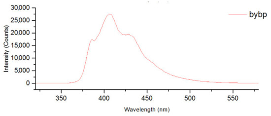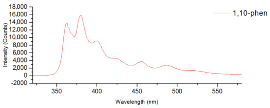 Complexes of Ag+ are known for their luminescence properties. N-donor conjugated molecules bonded to Ag+ cation increase their conformational rigidity leading to the reduction in energy loss by intramolecular vibrational and rotational motions and, as a result, to enhanced luminescence [22]. Moreover, the nature of the luminescence is determined by the ligand structure and the structure of obtained metal complex. Emission bands of free 1,10-phen and dpbp (Figure 21 and Figure 22) are located in the wavelength region 350–500 nm and overlap with excitation spectra of the chalcocyanide cluster complexes, which cover the wavelength region from 210 to more than 500 nm. Thus, there is every reason to assert that intense and long-lived emission of compounds 1, 2, 5 and 6 can be attributed to the Förster Resonance Energy Transfer (FRET) mechanism with the Ag+ complex acting as donor and cluster anion as the acceptor because of the mentioned overlap of their emission and excitation spectra.