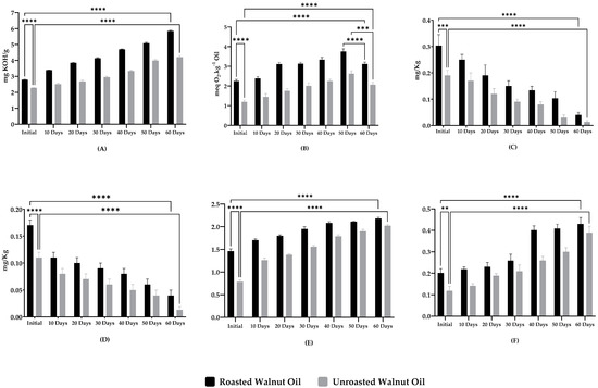 Concerning the peroxide value (PV), it represents one of the most widely used quality parameters to track the lipid oxidation and control the quality of the oil [60], providing a quantitative measure of the primary oxidation product levels in oils and fats [61]. According to the IOC (International Olive Council), 15 meq O2·kg−1 is the upper limit of acceptable oil quality [62]. Regarding the starting peroxide values, the UWO reached a value of 1.19 ± 0.09 meq O2·kg−1 while the RWO recorded a value of 2.25 ± 0.08 meq O2·kg−1, (Figure 1B) which means that the roasting process directly influences this parameter by increasing its value significantly (p < 0.0001). These values continued to increase until the 50th day to find the highest value with 2.62 ± 0.15 meq O2·kg−1 and 3.75 ± 0,14 meq O2·kg−1 for the UWO and RWO, respectively, and after that. they dropped to 2.06 ± 0.13 meq O2·kg−1 for UWO and 3.12 ± 0.09 meq O2·kg−1 for RWO (p < 0.0001). This decrease (between the 50 and 60 days for both RWO and UWO) can be explained by the fact that the peroxide index provides quantitative measurements on the primary oxidation products. It can be observed that the values increased from the first day until the 50th, which is the peak value of this index (PV). After that, the products of primary oxidation underwent a second oxidation to transform to volatile secondary oxidation products such as aldehydes [63], which are not detectable by this parameter (PV). For this particular reason, a decrease in the values in a significant way (p < 0.0001) was observed. Overall, the findings revealed that roasting and storage time influenced the PV results by increasing its values, but at the end of the study, RWO and UWO still showed conforming values according to the International Olive Council below the limit of 15 meq O2·kg−1.