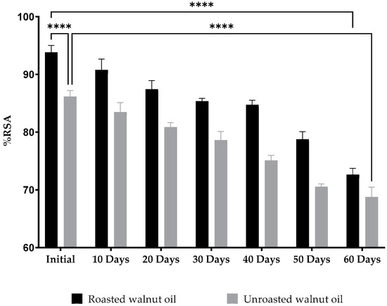 In this study, changes in the spectrometric absorbance were used to plot the histogram of radical scavenging activity evolution (Figure 2). However, our results showed that walnut oil had a very high antioxidant capacity in accordance with the literature [107,108,109,110], with RSA percentages above 60% for all of the samples. Initial values of %RSA were equal to 86.15 ± 1.08% for UWO and 94.81 ± 1.20% for RWO, which were significantly different (p < 0.0001). Contrary to what we expected, it can be easily concluded that, initially, roasting has a direct impact on antioxidant activity by increasing the power and capacity of the oil to scavenge the DPPH free radicals. These results can be explained by the fact that during the roasting process, Maillard reaction products (MRPs) are formed after the initiation of chemical reactions between reducing sugars and amino acids present in the oils [111,112], which leads to a significant enhancement in the antioxidant capacity [113,114]. However, this activity will decrease with time, under the influence of the temperature applied during the storage period (two months) with a loss of 17% for RWO and 13% for UWO at the end of the study (p < 0.0001). This may be due to the considerable content of tocopherols (vitamin E) in Juglans regia oil [115,116,117], which acts as an essential antioxidant that protects the oils from degrading and losing their properties [118].