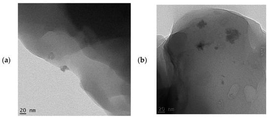The SEM micrographs of the pure starch (representing the negative control sample) and that of lignin–cellulose nanofiber-filled thermoplastic starch composite film (the target sample) are shown in Figure 1 and Figure 2, respectively. The SEM micrograph of the pure starch, as seen (Figure 1), showed the characteristic near-spherical morphology of the cassava starch granules with varying sizes [14]. The micrograph showed that the starch granules were generally in the order of sizes that ranged between 2 and 7 µm. This morphology is, however, destructured during the starch gelatinization process, subsequent to the incorporation of the fillers, in order to pave the way for good mixing in the composite formation stage. In Figure 2, the SEM micrograph shows that the fillers (lignin and cellulose nanofiber) were homogeneously distributed within the matrix of the starch nanocomposite film, a situation that usually results in improved mechanical properties. The white dots with varying sizes on the composite are considered as the fillers embedded in the starch matrix. The sizes of the cellulose nanofibers and lignin were evaluated using transmission electron microscopy (TEM), and their respective micrographs were as shown in Figure 3a,b. It was observed that the sizes of the cellulose nanofibers varied from 20 to 100 nm, while those of lignin fell between 20 and 200 nm. The determined characteristics of the used cellulose nanofiber are hereby shown in Table 1.