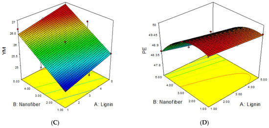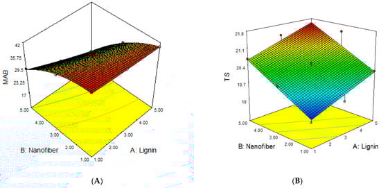 The response surface plots for the influence of lignin and cellulose nanofiber contents on the MAB, TS, YM and PE of the lignin–cellulose nanofiber-filled thermoplastic starch composite film are presented in Figure 4.