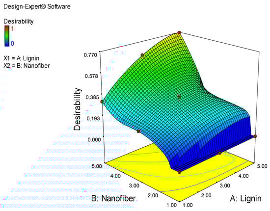 In the optimization selection, two factors (lignin and cellulose nanofiber contents) were considered in order to build desirability indices. The objective was to reduce the MAB while improving TS, PE and YM; therefore, the target value of the responses was lowest for MAB and highest for TS, PE and YM from the experimental results obtained.