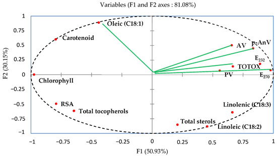 The content of phytochemical compounds (pigment contents, PUFA, total sterols, and total tocopherols), analytical parameters (AV, PV, p-AnV, TOTOX, E270, and E232), and the radical scavenging activity (RSA) was submitted for principal component analysis (PCA). As seen in Figure 1, the PCA utilizes the F1 and F2 factorial plan to project the variables. The first principal component (F1) describes 50.93% of the variation, whilst the second main component (F2) represents the remaining 30.15%. The combined percentage of the two first primary components contributed to 81.08% of the total variation; therefore, its linear combination is reflective of the factors since it exceeds 50%. Further, the first two axes are adequate for representing the data in their entirety.
