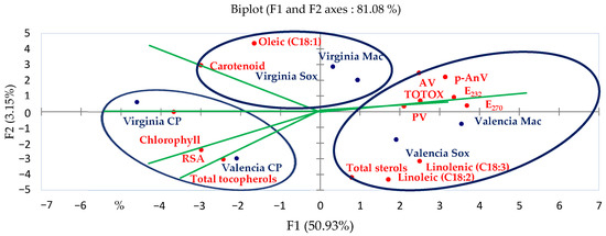 Figure 1 depicts the plane produced by the F1 and F2 axes, representing the variable correlation. The F1 axis is primarily formed by the positive association between AV, p-AnV, TOTOX, PV, E232, and E270, and the negative association between the total sterols, linoleic (C18:2), and linolenic (C18:3) fatty acids. Additionally, the variables RSA, total tocopherols, chlorophyll, and carotenoid contents, were scattered throughout the F2 axis on both the positive and negative flanks. These results are coherent with those of the correlation analysis.
