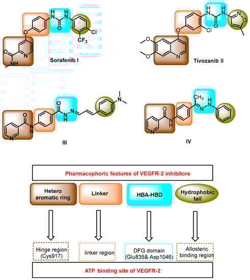 Sorafenib I, tivozanib II, compound III, and compound IV share four essential pharmacophoric features required for good fitting with the VEGFR-2-binding sites, such as the ATP-binding site, the gatekeeper region, and the DFG motif region. Such pharmacophoric features comprise the following: (i) A hetero aromatic system to occupy the hinge region of the ATP-binding site. In this region, there is an essential amino acid (Cys917) that should be incorporated in the binding interaction. (ii) A linker group to occupy the gatekeeper region of the active site. (iii) A pharmacophore nucleus (a collection of HBD and HBA) to occupy the DFG motif region. The pharmacophore moiety should bind efficiently with Asp1044 and Glu883 to exert maximal activity. (iv) A terminal hydrophobic tail to occupy the allosteric binding pocket of the ATP-binding site [15,30,31].