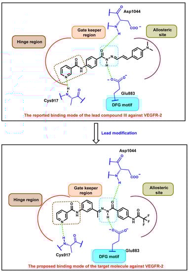 In this work, compound III was used as a lead compound to discover a new VEGFR-2 inhibitor. Compound III was subjected to chemical modifications at two positions. The first position is the pharmacophore moiety, because we changed the orientation and bulkiness of the hydrazone moiety. We applied the same pharmacophore moiety of compound V. This modification may increase the hydrogen-bonding interaction at the DFG motif region. The second position is the terminal hydrophobic tail. We applied the extension strategy (addition of an extra function group). In this strategy, the N,N-dimethylamino group attached to the 4-postion of the terminal phenyl ring was substituted with the 2,2,2-trifluoroacetamide moiety. This modification may increase the chance of forming extra interactions in the allosteric binding site (Figure 2). Accordingly, the designed compound contains essential features to bind with and inhibit VEGFR-2.