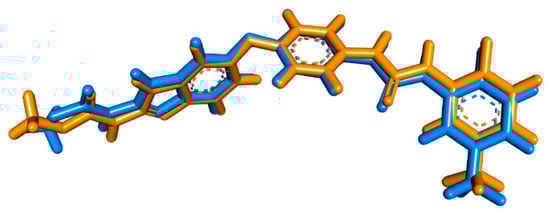 Molecular docking was performed to scrutinize the correctness of the carried-out design [32,33,34]. The validation of the docking algorithm was accomplished by re-docking the co-crystallized ligand in the active site of VEGFR-2 (PDB ID: 2OH4) [35,36]. The obtained RMSD between the docking pose and native crystallographic pose was 0.65 Å. This accepted value signposted the validity of the nominated docking algorithm (Figure 3).