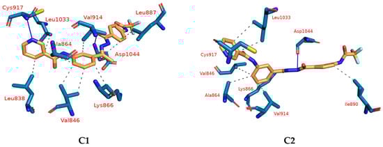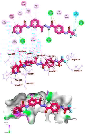 Docking of sorafenib into the active site of VEGFR-2 was found to retrieve the reported binding mode [17,37,38] and reproduced a binding pose with a docking score of −20.19 kcal/mol. Sorafenib interacts using the NH of its pyridine scaffold with the hinge region residue Cys917. In addition, it achieved hydrophobic contacts with the hydrophobic pocket residues Leu887, Leu1017, Ile890, Ile886, Ile890, and Ala864. In the gatekeeper area, many hydrophobic interactions were observed with Val914, Val897, Phe1045, and Cys1043. The urea linkage finally served as a pharmacophore moiety and interacted with the key amino acid residues Asp1044 and Glu883 in the DFG motif (Figure 4).