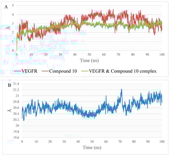 Measurements calculated from the MD trajectory: (A) RMSD—VEGFER-2 is the blue curve, compound 10 is the red curve, and complex is the green curve; (B) RoG; (C) SASA; (D) change in the number of H-bonds; (E) RMSF; and (F) center of the mass distance between compound 10 and VEGFR-2.