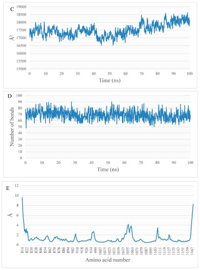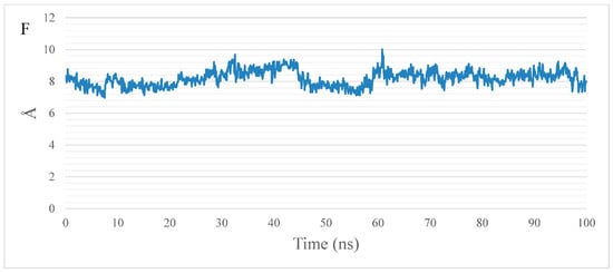 MD simulations were performed to validate the docking studies. The analyses performed on the production run show that the system equilibrated after approximately 30 ns. The RMSD plot (Figure 6A) showed a stable average after the first 30 ns at 2.6 Å for the protein (blue curve) and the complex (green curve). On the other hand, the RMSD of compound 10 (red curve) showed large fluctuations with an average of 3 Å. The RoG (Figure 6B), SASA (Figure 6C), and H-bonds (Figure 6D) showed a stable protein fluctuation with an average of 20.59 Å, 17,378 Å2, and 69 bonds. The fluctuation of the amino acids depicted in the RMSF plot (Figure 6E) showed low fluctuation (less than 2 Å) except for the free N-terminal, R1049:A1063, K1108:E1111, and the C-terminal, reaching 10 Å, 4 Å, 3.4 Å, and 8 Å, respectively. During the simulation, the ligand remained nearly in its place relative to the protein center of mass, with an average of 8.1 Å (Figure 6F).