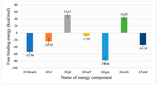 Energetic components of MM-GBSA and their average values. The bars represent the standard deviation of each energetic component.