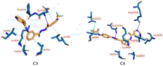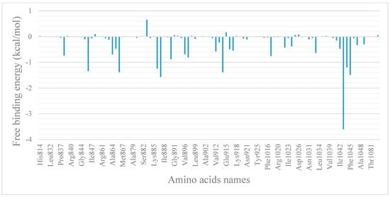 Figure 7 shows the different components of the binding free energy analysis using MM-GBSA. Compound 10 showed a total binding with an average value of −34.14 Kcal/mol. The largest favorable contribution is the van der Waals interaction with an average value of −53.96 Kcal/mol followed by the electrostatic interaction, with an average value of −24.1 Kcal/mol. Moreover, we performed a decomposition analysis (Figure 8) to know which amino acids within 1 nm of the ligand have the highest contribution to the interaction. Val846 (−1.34 Kcal/Mol), Lys866 (−1.38 Kcal/Mol), Ile866 (−1.24 Kcal/Mol), Leu887 (−1.56 Kcal/Mol), Val914 (−1.38 Kcal/Mol), Cys1043 (−3.6 Kcal/Mol), Asp1044 (−1.19 Kcal/Mol), and Phe1045 (−1.49 Kcal/Mol) are the amino acids that have a contribution with a value better (less) than −1 Kcal/Mol.