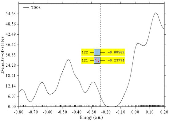 The total density spectrum, displayed in Figure 12, was created using “the total density distribution function, TDOS,” because FMO analysis might not completely characterize electron density due to the potential of quasi-degenerate levels. The highest electronic density was recorded for orbitals higher than the LUMO orbital, as depicted in Figure 12.
