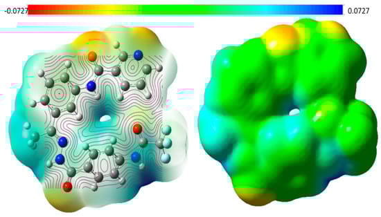 The generated potential mapping of the synthesized heterocyclic molecule at the level DFT/B3LYP/6-311++G (d,p) is displayed in Figure 13. The ESP surface maps describe the intermolecular interaction and the behavior of the molecule toward the target. The ESP map demonstrates how oxygen atoms as expected represent active negative sites on the surface of the molecule. The most favorable reactive sites for nucleophilic attack are located over hydrogen atoms and are colored blue, while active sites for electrophilic attack are colored red on oxygen atoms. The fluoride ions are colored green, denoted as neutral active sites. The difference in electrical charge distribution may make the prepared anticancer medication a potential inhibitor.