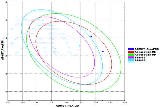 In addition to its biological activity, compound 10 has to be evaluated for its pharmacokinetic performance to be approved as a drug. So, any new compound should be evaluated for its ADMET properties at an early stage of drug development to reduce late drug withdrawals [41]. The ADMET model identifies the absorption, distribution, metabolism, excretion, and toxicity properties. There are various in vitro studies that can be performed to investigate ADMET properties, but in silico studies are more advantageous for a number of reasons, including cost, time, and effort limitations, in addition to strict regulations regarding animal testing [42]. The designed pyridinyl derivative was compared with sorafenib as a reference molecule, using Discovery Studio software to calculate ADMET parameters. Figure 14 demonstrates the examined ADMET profiles represented as ellipses: lipid–water partition coefficient (AlogP98, blue point); intestinal absorption (95% confidence limit (red ellipse) and 99% confidence limit (green ellipse); blood–brain barrier (BBB) (95% confidence limit (pink ellipse) and 99% confidence limit (turquoise ellipse). The two points lie outside the pink and turquoise ellipses and inside red and green ellipses explained that there were high degrees of similarities between the designed pyridine derivative and sorafenib in ADMET results (Figure 14). Both compounds had very low BBB transmembrane properties and good intestinal absorption levels, and neither compound was anticipated to inhibit the cytochrome P-450 (CYP2D6). The aqueous absorption and the ability to bind with plasma protein were computed to be low—less than 90% for the designed pyridine derivative and sorafenib.