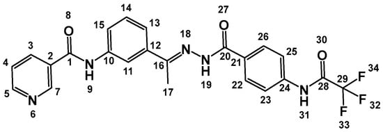 The IR spectrum (Figure S1 in the Supplementary Materials) of compound 10 was characterized by the appearance of carbonyl absorption bands at 1677 cm−1. The 1H NMR (Figures S2–S6 in the Supplementary Materials) revealed the presence of a characteristic 3H singlet signal at 2.35 ppm, corresponding to the CH3 group. Additionally, downfield singlet signals concerning the amidic protons have appeared at δ 10.62 and 10.30 ppm. The protons (3, 4, 5, and 7) of the pyridine ring (Figure 15) resonated at δ (8.67, 7.86, 8.90, and 9.32, respectively). Additionally, the meta-substituted benzene ring’s protons (11, 13, 14, and 15) appeared at (8.25, 7.43, 7.58, and 7.93 respectively). Furthermore, the di para substituted protons—protons (22, 26) and (23, 25)—resonated at δ 7.81 (d, J = 8 Hz) and δ 7.09 (d, J = 8 Hz), respectively. The validity of the proposed structure was also supported by 13C NMR spectra (Figures S7–S11 in the Supplementary Materials), which showed distinctive peak at 14.42 ppm, corresponding to the CH3 group.