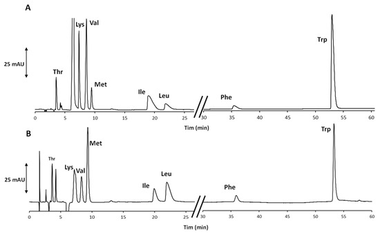 The validation study performed on Leu and Phe allowed us to ascertain the high statistical quality of the developed method, which was therefore applied for the quantitative analysis of the single AAs contained in the selected food supplement. Extract solutions were analyzed in triplicate with the optimized and validated IP-RP-HPLC method. An excellent repeatability among successive runs was obtained both for retention times and peak area values. Indeed, the RSD%s for the former were ≤ 0.22, while for the latter ≤ 2.50. The quantitative analysis of the food supplement revealed that six out of eight AAs were present in amount very close (from approximately 90% up to 95%) to that declared by the producer, while it was lower for Met (close to 80%) and Trp (close to 70%).