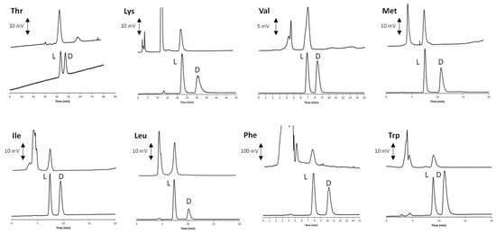 The optimal water-EtOH eluent was then employed for the enantioselective analysis of the remaining compounds. According to the data listed in Table 3, excellent performances were always obtained with the above RP mobile phase. The enantiomeric L < D elution order (EEO) was established by injecting pure standards of known stereochemistry. In Figure 3, the chromatograms of all the eight AAs contained in the food supplement (here analyzed as either racemates or enantiomeric mixtures) are shown (bottom lines of all inserts).