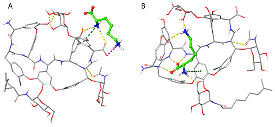 Best interaction frames of the molecular dynamics run of the teicoplanin with the Lys, in grey and green carbon atoms, respectively. The hydrogen bond, π-cation, and charge–charge interactions are shown in yellow, green, and magenta dashed lines, respectively. The panel (A) displays the frame where the Lys engages multiple interactions with the carboxylic moiety of the selector, while panel (B) shows the interactions engaged in the teicoplanin basket.
