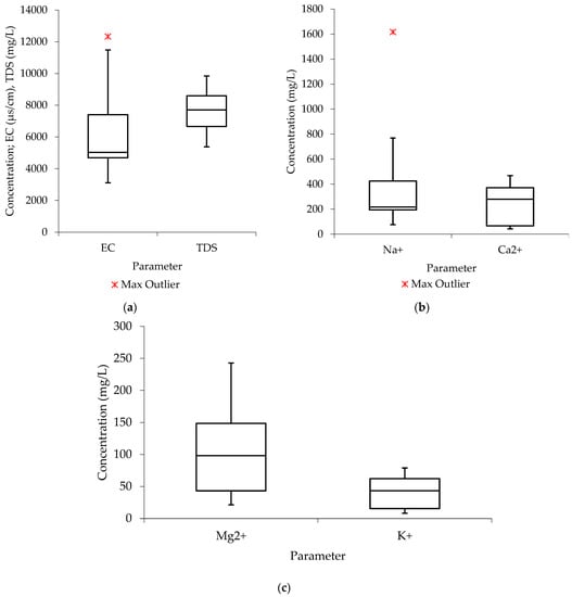 Additionally, potassium concentrations were measured at a low of 8 mg/L, a maximum of 79 mg/L, and an average value of 42 mg/L. Total dissolved solids were measured with a minimum concentration of 5377 mg/L and a maximum concentration of 9845.5 mg/L, with an average value of 7680 mg/L. Electrical conductivity was also measured with a minimum concentration of 3114 μS/cm, a maximum concentration of 12,328 μS/cm, and an average concentration of 6286 μS/cm. It should be noted that measuring the electrical conductivity of irrigation water is a more convenient and indirect way to find out how much salt is present in it. The concentration of salt increases with conductivity [