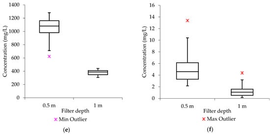 +), respectively, indicating that the water quality data are positively skewed, with a larger frequency of high-concentration values than low-concentration values. Additionally, the median is seen to be nearer the center in the boxplots from