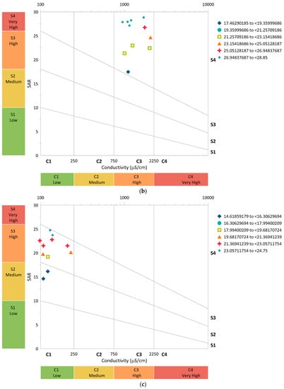 Figure 5b shows that the majority of the samples from the raw groundwater fell within the C3S4 range. According to electrical conductivity, the majority of the samples fell into the “high salinity” C3 class, and according to water quality, the water can be used for irrigation with appropriate management techniques. Additionally, according to the SAR, the majority of the samples were classified as S4, or “extremely high sodium hazard,” which indicates that the water is typically unsuitable for irrigation. Still, such water has to be purified before being used for irrigation for most of the plant species in the world. The salinity hazard potential analysis from the wastewater treated at a 1 m column depth is summarized in