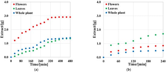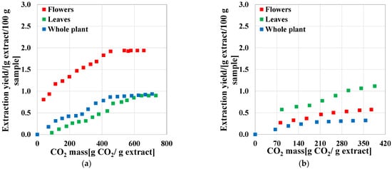 Extraction curves for plant samples. (a) First extraction stage: solid sample; (b) second extraction stage: solid sample + 10 wt% co-solvent.