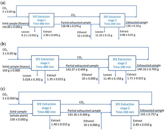Mass balances for supercritical extraction of Lophanthus anisatus samples: (a) flowers; (b) leaves; (c) whole aerial plant.