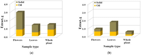 From the analysis of the extract samples, the existence of two phases was observed: oil and solid, with the largest amount of oil being extracted from flowers. In Figure 4a, the oil content in all extracts obtained in the first extraction stage is presented (by weighing of extract phases): 33% oil present in extracts from flowers, and 50% oil from whole plant extract. The extract obtained from the second stage contains traces of ethanol (Figure 4b).
