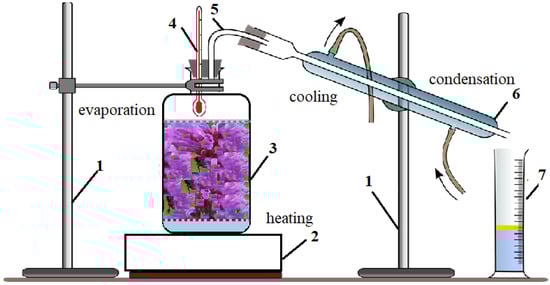 The stability of the installation was ensured by means of two stands. A 2000 g amount of dried Lophanthus anisatus plant (the whole aerial plant, and part of the plant: leaves and flowers, respectively) were introduced into the vessel, 3, with a capacity of 17 L, and covered with 10 L of distilled water (HD) mixed with 35 % bio-alcohol (BiAD), respectively. The mixture was heated by an electric hob, 2. The temperature inside the boiling vessel was monitored by means of a thermometer, 4. The extraction vessel was connected to the cooling refrigerant, 6, through a steam collection pipe, 5. The refrigerant had two enclosures, the outer jacket through which the cold water circulated, with a role in cooling the collected vapors, and the inner channel through which the condensate circulated. The latter was collected in a graduated cylinder, 7. The obtained products were analyzed to determine the chemical composition by various methods and used for antimicrobial activity trials.