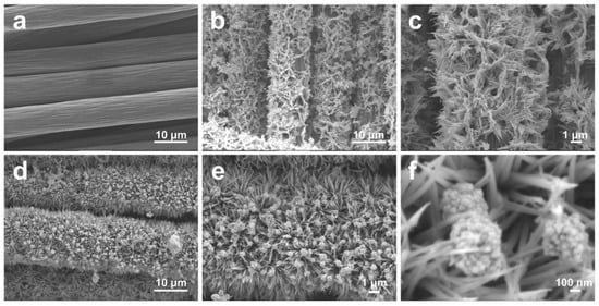 Figure 1 shows the SEM images of the as-prepared samples. The smooth surface of the carbon cloth can be seen in Figure 1a. After being treated in a Tris-HCl solution (pH = 8.5) for 12 h, the DA molecules were, firstly, polymerized into a conformal PDA film on the carbon cloth substrate in a weak alkaline solution, and the sequential heat-treatment at 800 °C for 2 h promoted the rich nitrogen atoms in the PDA film to interact with the carbon networks in the carbon cloth. Eventually, the substrate of the nitrogen-doped carbon cloth (NC) was readily prepared [14]. Figure 1b,c exhibit the anchoring process of the uniform NiCo2O4 nanowires. After another PDA layer was coated onto the exterior of the NiCo2O4 nanowires, the inherent reducing ability of the PDA coupling with the UV irradiation yielded a Ag/NiCo2O4-NC sample (Figure 1d). It can be observed in Figure 1e,f that the conductive NiCo2O4 nanowires served as the ideal supports for the Ag nanoparticles. This, in turn, enabled the full exposure of different reactive planes and surface active sites of Ag nanoparticles to achieve the enhanced glucose-sensing capacities.