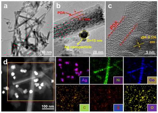 Figure 3 shows the TEM, HR-TEM images and the elemental mapping of the Ag/NiCo2O4-NC sample. As can be clearly observed in Figure 3a–c, the NiCo2O4 nanowires were covered with PDA films with a thickness of 8 nm, and Ag nanoparticles in an approximate 15 nm size range were anchored on the NiCo2O4 nanowires. The fully exposed planes of Ag nanoparticles provided more reactive surface sites for glucose-sensing applications [15]. In the HR-TEM image in Figure 3c, the PDA film together with the lattice fringe of the Ag (111) crystalline plane were visible, with an interplant distance of 0.236 nm. The STEM image and EDX elemental mapping spectroscopies in Figure 3d confirmed the presence of Ag, Ni, Co, C, N and O elements. The percentage of elements in the detected region was 15.47 wt.% for Ag, 4.55 wt.% for Co, 9.10 wt.% for Ni, 41.22 wt.% for C, 12.45 wt.% for N and 17.21 wt.% for O.