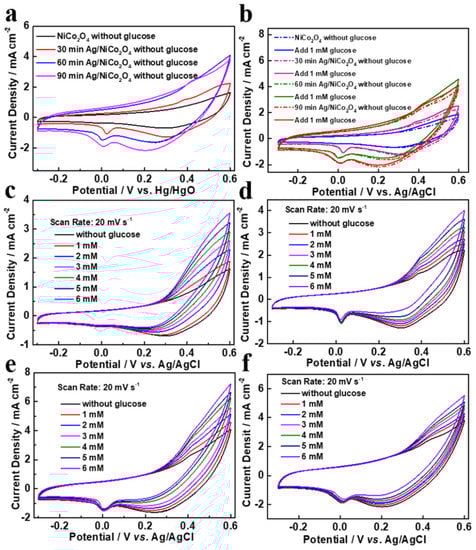 Figure 5 illustrates the CV curves of different samples in 0.1 M NaOH solution as electrolytes. As seen in Figure 5a, there was no reduction or oxidation peaks visible in the CV curve of the NiCo2O4-NC sample, which suggested that the NiCo2O4-NC sample did not deliver electrocatalytic activity in the 0.1 M NaOH solution. After the loading of Ag nanoparticles, the appearance of oxidation peaks at −0.3~0.60 V resulted from the oxidation of Ag+ on Ag/NiCo2O4-NC samples in 0.1 M NaOH. In contrast, in Figure 4b, the current densities increased after the addition of glucose, which indicated the electrocatalytic activity of the Ag/NiCo2O4-NC sample for glucose sensing [23]. Moreover, the larger current generated by the Ag/NiCo2O4-NC-60 sample compared with those of the Ag/NiCo2O4-NC-30 and Ag/NiCo2O4-NC-90 samples suggested that increasing the number of Ag nanoparticles favored glucose oxidation. It was noticed that the voltammetric responses of the NiCo2O4-NC and Ag/NiCo2O4-NC samples in Figure 5c–f increased linearly with the increasing concentrations of glucose in the concentration range of 1–6 mM, which could be attributed to the conversion between glucose and gluconic acid, as described in Equation (1).